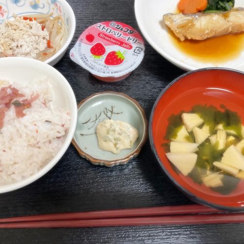 お昼ご飯はお楽しみ献立、桜ご飯、メバルの煮付け🌸