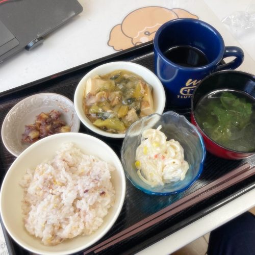 お昼は豆腐と豚肉の崩し煮、美味しい😋