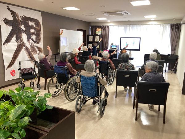 音楽に合わせて身体を動かしていきます👐(壁には施設長力作の「想」の書き初め🖌️)