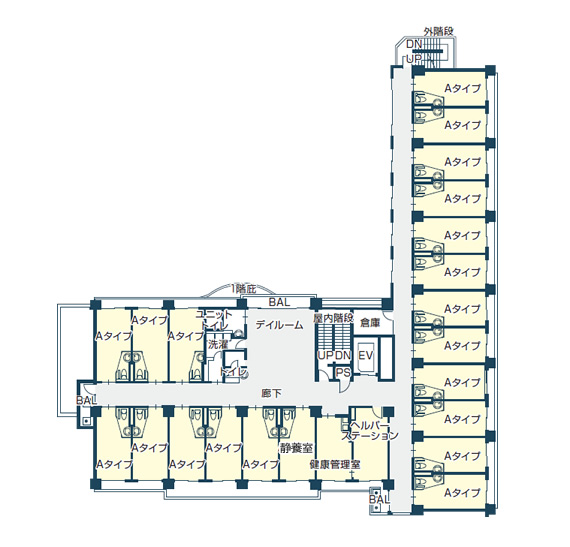 | 居室設備 | バリアフリー設計(手すり設置・段差なし)、温水洗浄機能付トイレ、エアコン、介護用電動ベッド、ケアコール(ハンディコール)、車イス対応トイレ、エレベーター、スプリンクラー及び防災設備、洗面台 |
