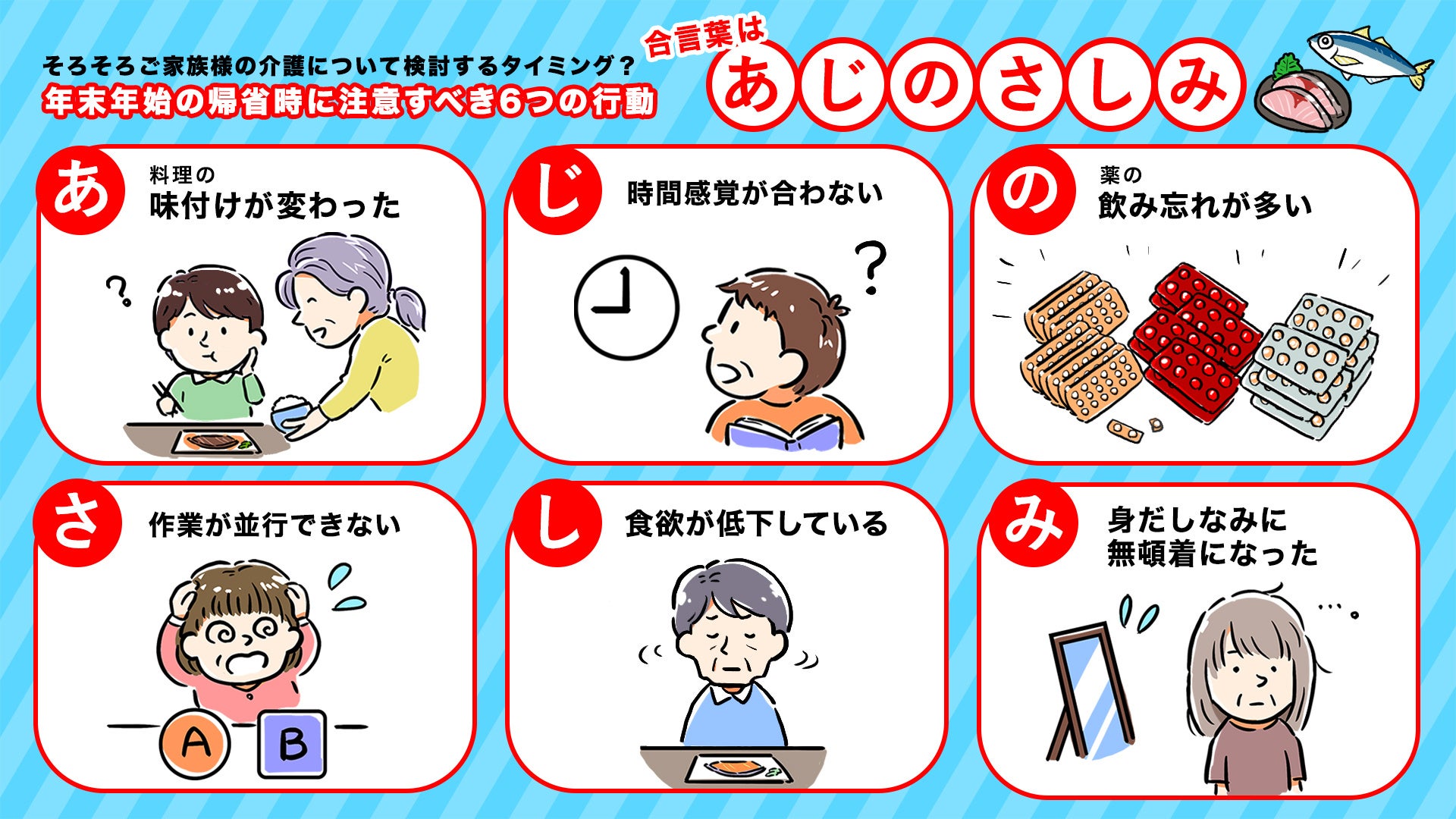 そろそろご家族様の介護について検討するタイミング? 年末年始の帰省時に注意すべき6つの行動 合言葉は「あじのさしみ」 ~運営する施設入居者様のご家庭190世帯へ施設入居に関するアンケート調査を実施~