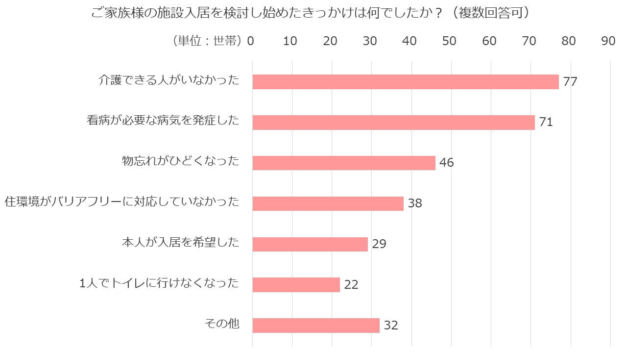 • 施設への入居を検討し始めたきっかけとして最も多かったのは「介護できる人がいなかった」「看病が必要な病気を発症した」や「物忘れがひどくなった」など、発病や認知症の進行がきっかけとなったケースも